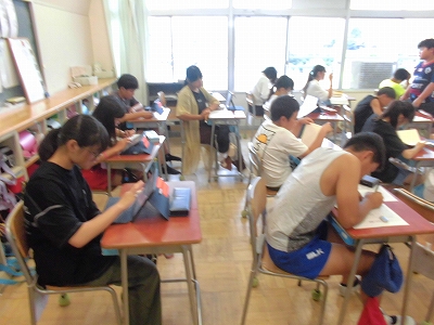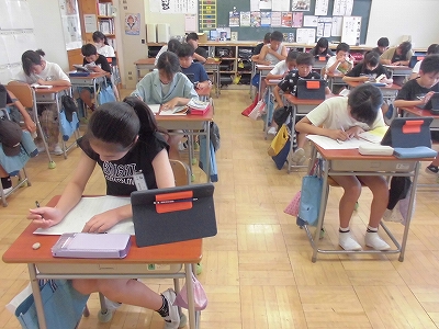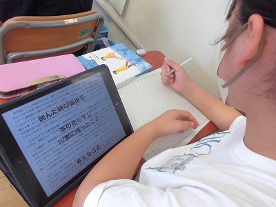 タブレットを活用して、読書感想文を原稿用紙に書いていきます。