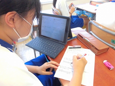 プリント学習です。タブレットに送られた解答でマル付けをします。