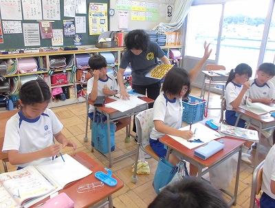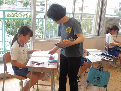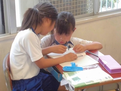 課題ができたか先生が回り、OKが出ると友だちにアドバイスします。