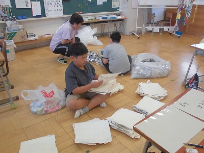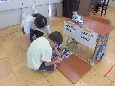 紙パックやアルミ缶など、形や種類を分類しながら工夫して数えます。