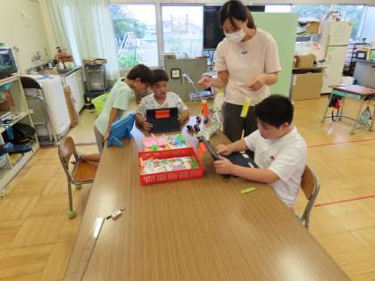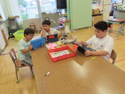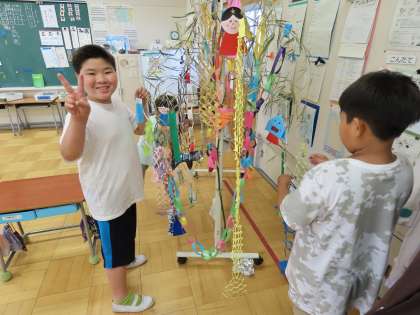 タブレットで七夕飾りを調べて、折り紙で作りました。どんなお願いをしたのでしょうか。