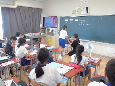 衣服への水のしみこみ方の実験結果をテレビモニターで確かめます。