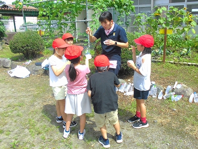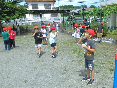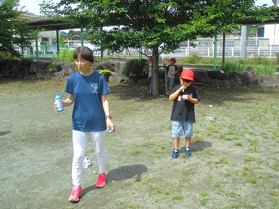 生活科で夏を楽しむ水遊びです。この時間はシャボン玉でした。