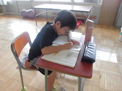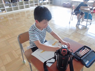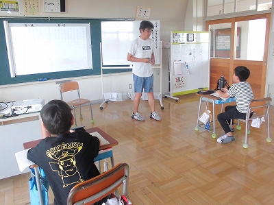 教科書を黒板に投影し「めあて」をノートに書き写す場面でした。
