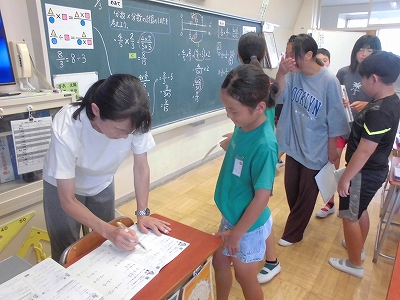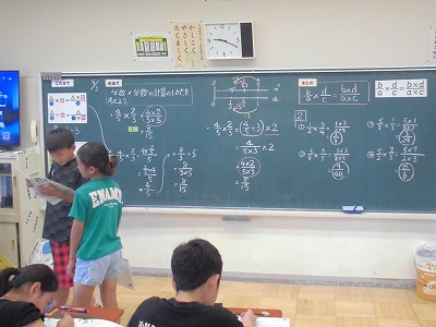 分数のかけ算についてまとめ、法則に従って次々と問題を解きます。