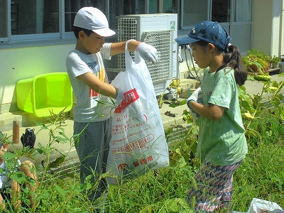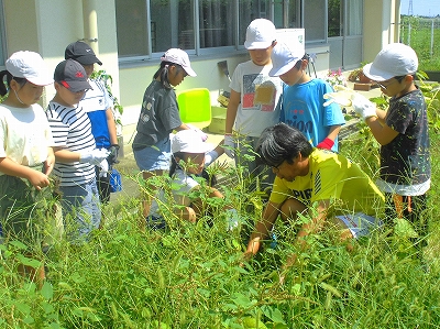 交流学級と一緒に協力しながら、学年菜園の除草作業です。