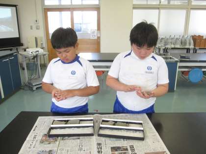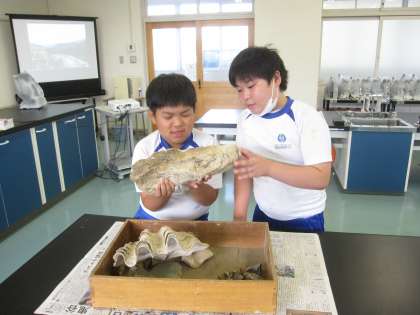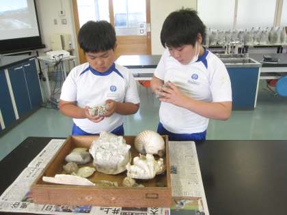 化石や堆積岩の観察をしました。化石には海にすむ生物が多いことから、地層が海でできたことを実感できました。