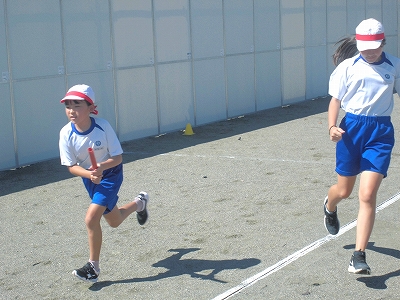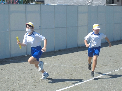 暑さ対策で、何とか2校時にリレーの練習ができました。