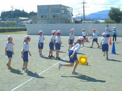 運動会の遊競技練習です。自分の団の色のコーンをたくさん残します。
