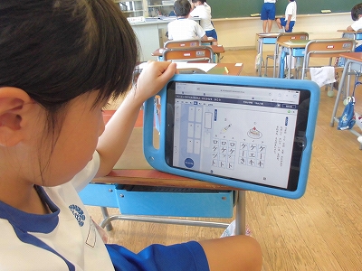 書写の時間もカタカナ練習です。なんとタブレットでも勉強できます。