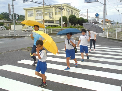 雨の修学旅行を想定して、雨具を利用しながら校外まで散策します。