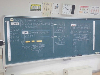 3つの数字の足し算です。ブロックを操作して確かめます。