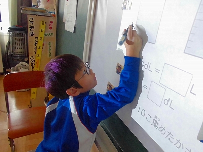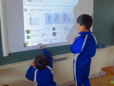 問題を映したプロジェクター画像に、巧みに答えを書き込んでいきます。