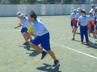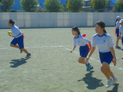 タックルのかわりに、背中のタグを取る、タグラグビーです。