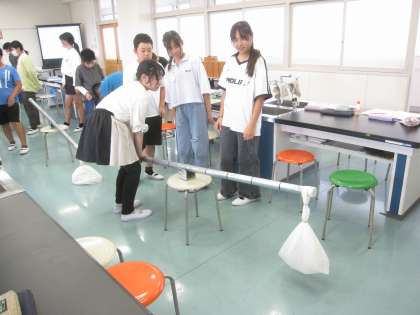 てこを使っておもりを持ち上げ、手ごたえを調べました。