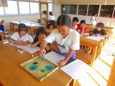 専用の絵の具を使って、宇宙をイメージしたマーブリングに挑戦です。