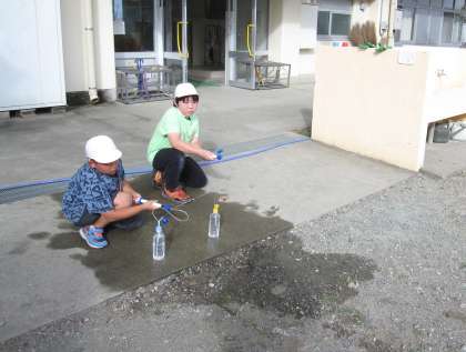 10月22日(火)ひまわり 理科 その2 公開日 2024/10/22 更新日 2024/10/22 できごと ペットボトルロケットも噴水もおしちぢめられた空気が水をおす力を利用していることがわかりました。