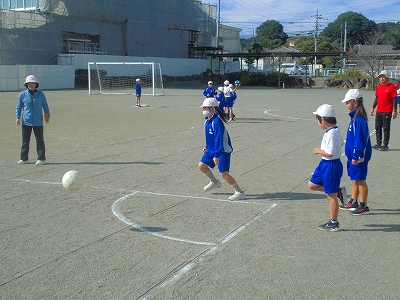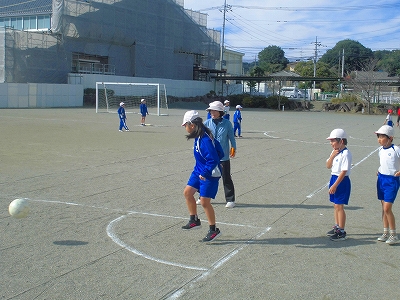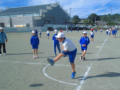 気持ちのよい校庭で、3つのコートに分かれて、キックベースです。