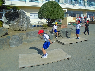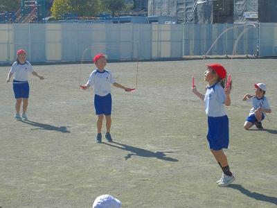 縄跳びで体力づくりです。この時期、専用のジャンプ台が役立ちます。