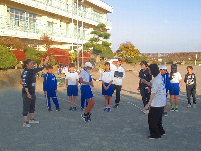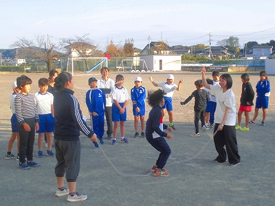 なわ跳びのダブルダッチに挑戦するスポーツクラブの様子です。