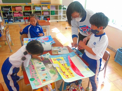 友達の絵の良いところに刺激を受け、班ごとに最後の仕上げです。
