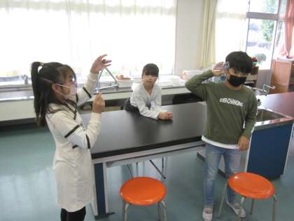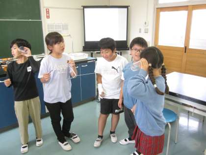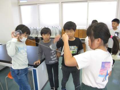音がつたわるとき、音をつたえる物がふるえているか調べました。