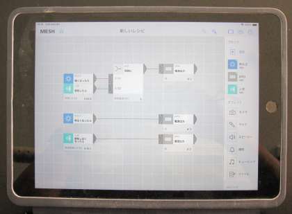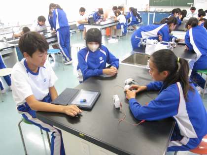 次に、気温が30°C以上になって人が通ったときだけ回る扇風機のプログラムを考えました。課題を解決できた班は、いろいろなIoTブロックを使って、自由にプログラミングをしました。