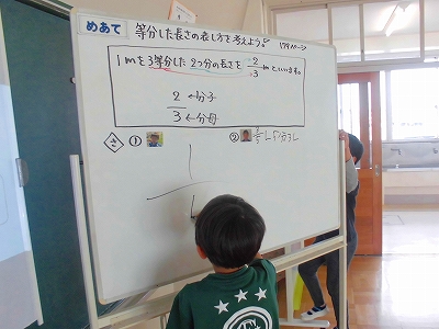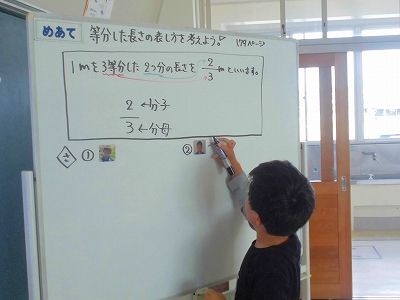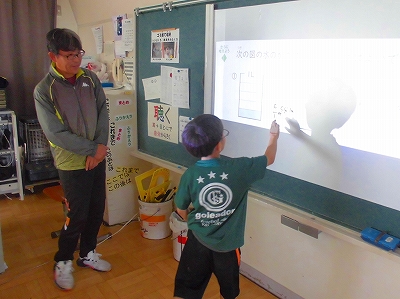 ホワイトボードや投影された黒板に答えを記入していきます。