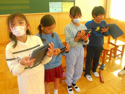 タブレットに送られた、楽譜と歌詞を見ながら歌います。