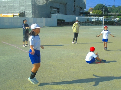 なわ跳びです。ペアになって跳び続けられた回数を数え合います。