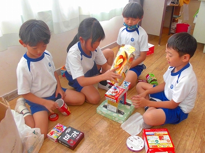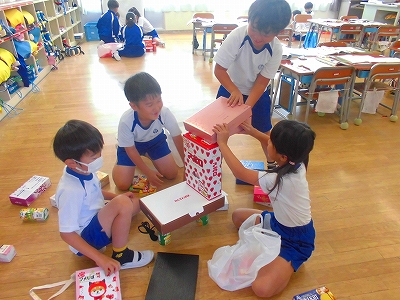 図形の学習の導入で、まずはいろいろな形の箱や容器に興味を深めます。