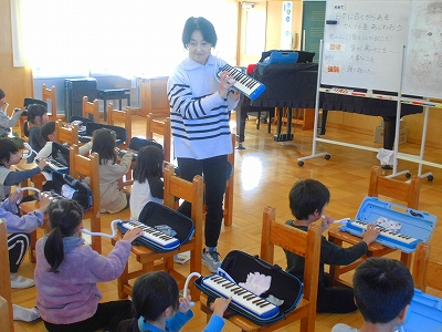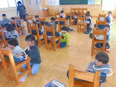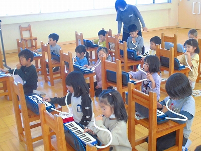2クラス合同で、鍵盤ハーモニカの指使いを練習します。