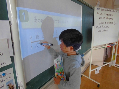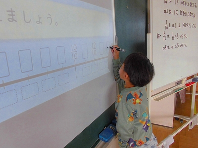 活躍の場面を設定するため、数直線に分数と小数を書き入れます。