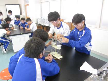 水よう液をガラス棒に伝わらせて、ろうとに静かに流しこみました。