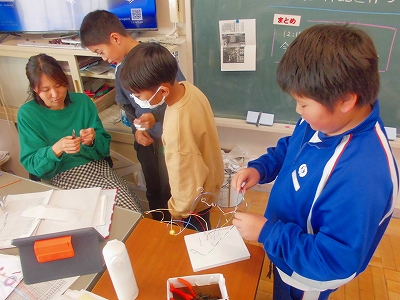 カラフルな針金を細工しながら、アート作品を仕上げていきます。