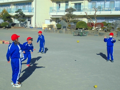 キャッチボールの後、ボールを投げて的に当てる練習をしました。