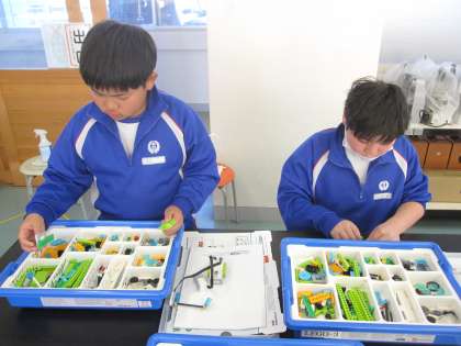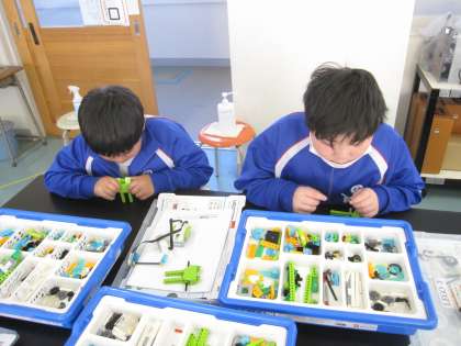 レゴブロックを組み立てて、プログラミングロボットを作っています。