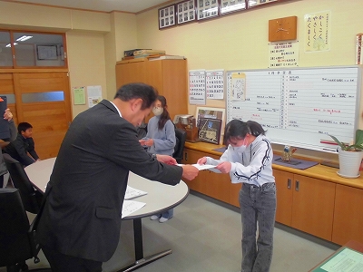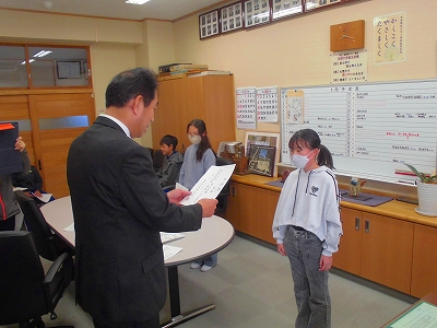 校長室で行われた5年生の任命式のようすです。