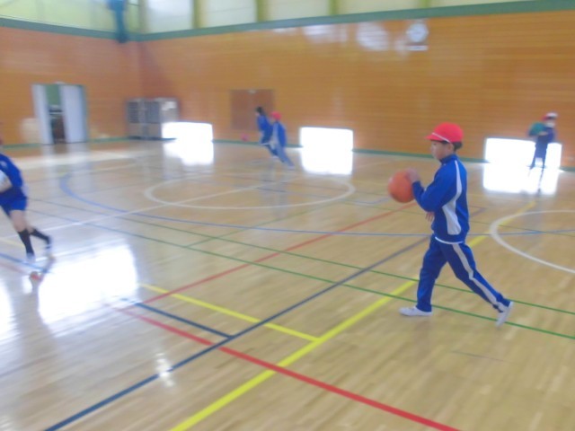 ゲームの前に、ドリブル鬼ごっこやチーム対抗シュート対決などで基本技術を磨きます。