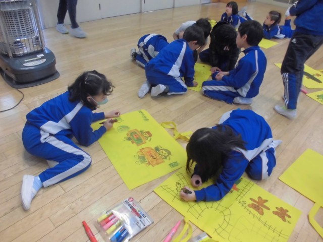 ペンを共有しながら、床にバックを広げて、好きなイラストを描いていきます。
