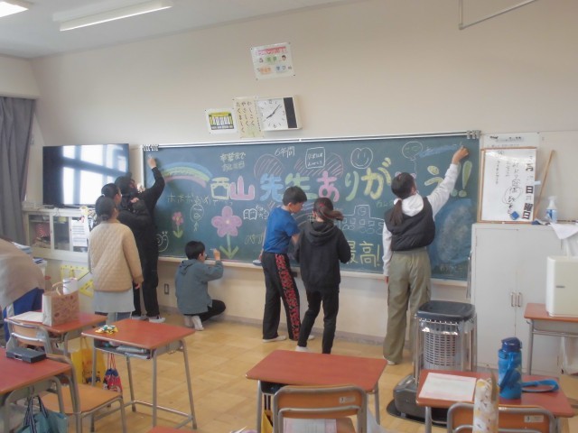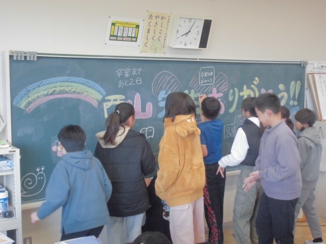 3月21日(金)6年生 担任へのサプライズ 公開日 2025/03/21 更新日 2025/03/21 できごと 卒業前のあるある、黒板アートで担任の先生へのサプライズです。教室になかなか入れてもらえない担任も薄々気付きましたが、子どもたちの気持ちは嬉しいものです。 +6