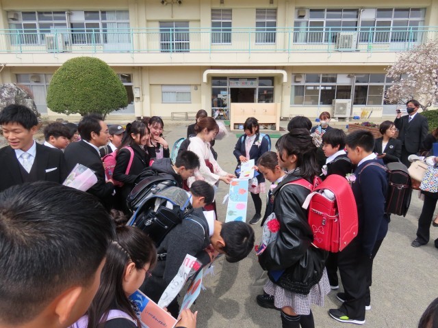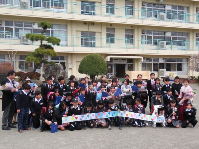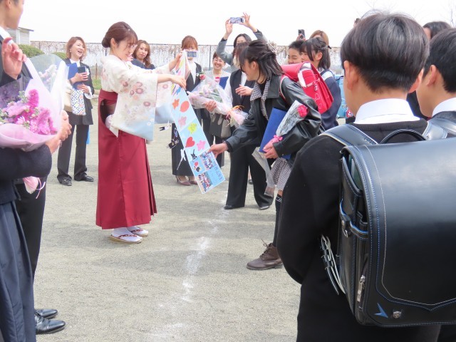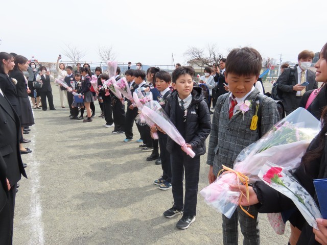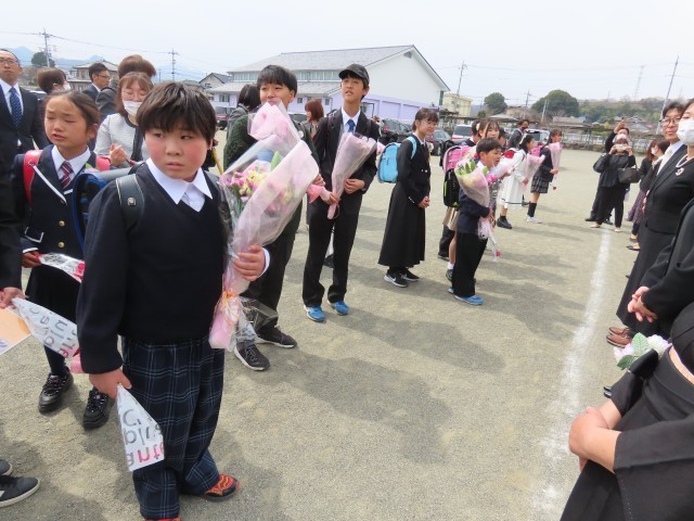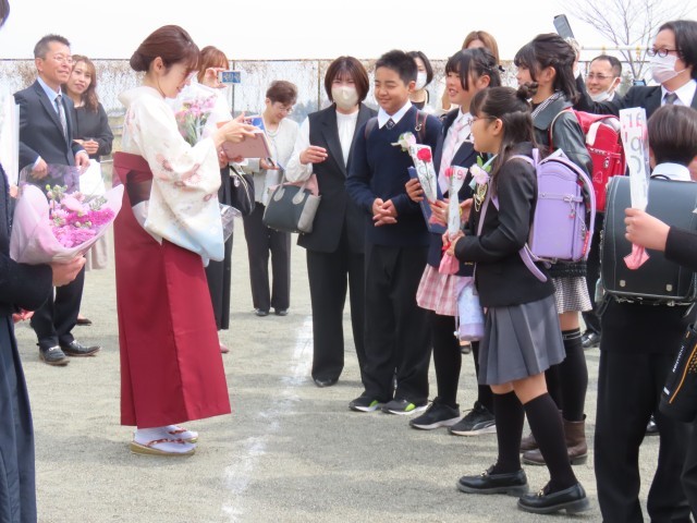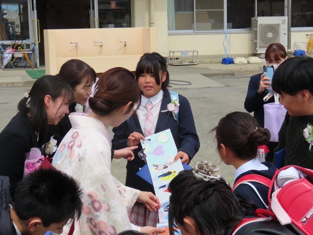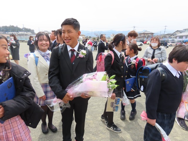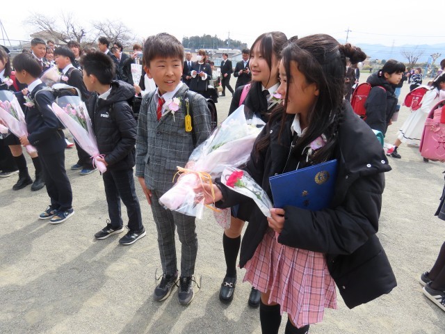 3月24日(月)卒業式 その12 公開日 2025/03/24 更新日 2025/03/24 できごと 何と全員の先生へ花束のプレゼントをいただきました。担任へも子どもたちの心を込めた手作りプレゼントが渡され、最後にみんなで記念撮影をしました。とても厳粛な卒業式でしたが、みんなの温かい心が通じ合えたとても雰囲気のよい、記念すべき一日となりました。 +7