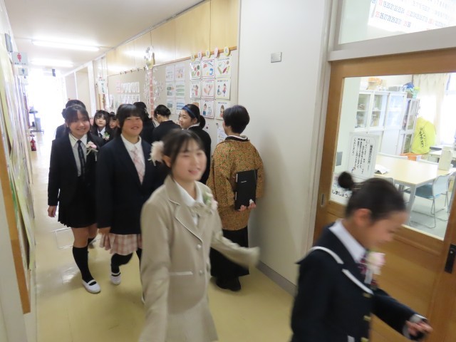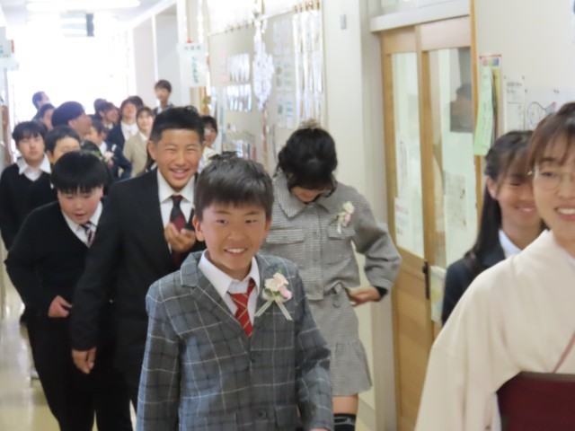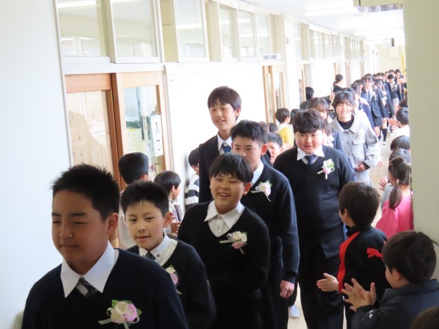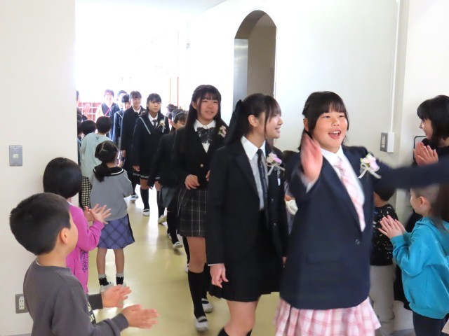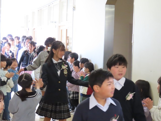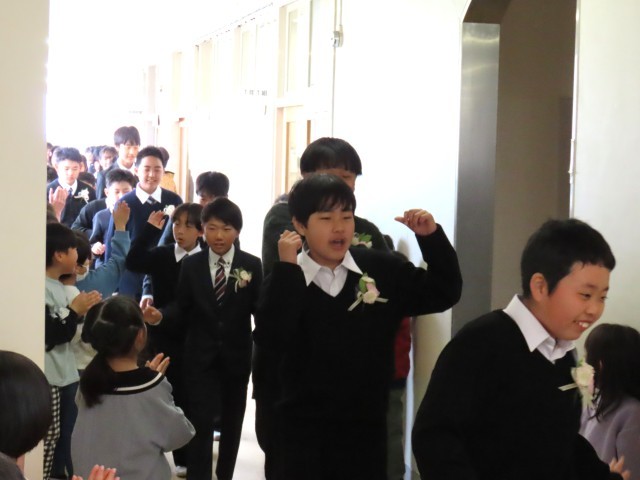卒業式に参加できない低学年のためにも、校舎内を巡り、全学年の子どもたちから拍手で見送られます。