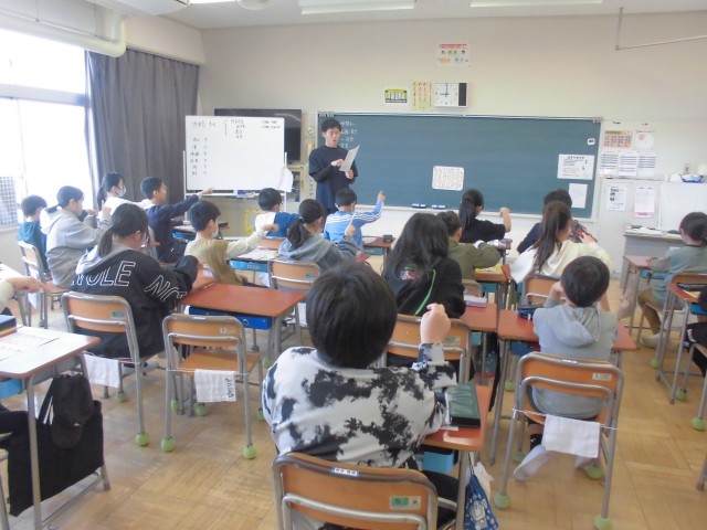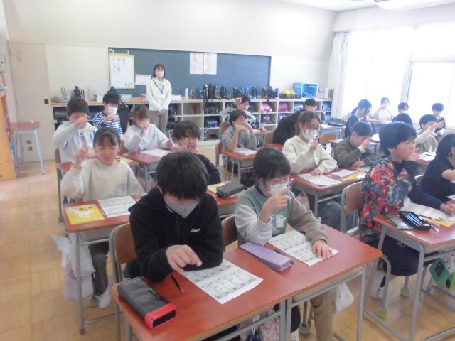 新出漢字をみんなで空書きしてから、プリントで練習します。