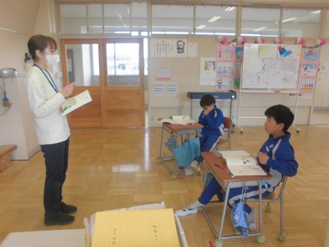 ふた学年の同時授業です。1年生の入学で、先輩の上級生が上手に気を遣います。