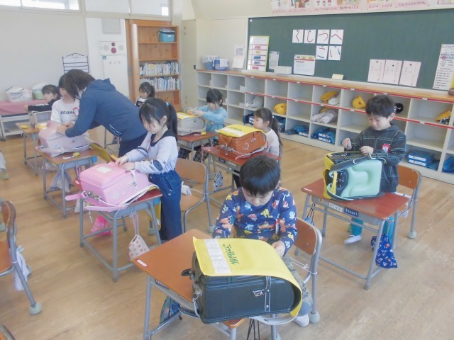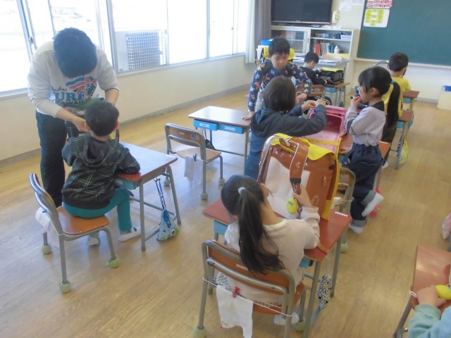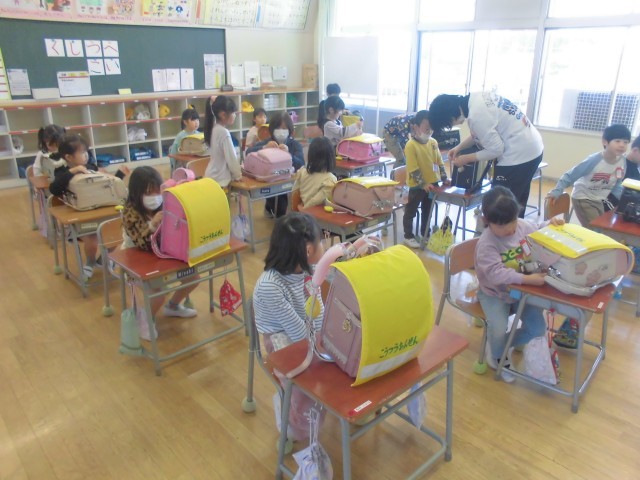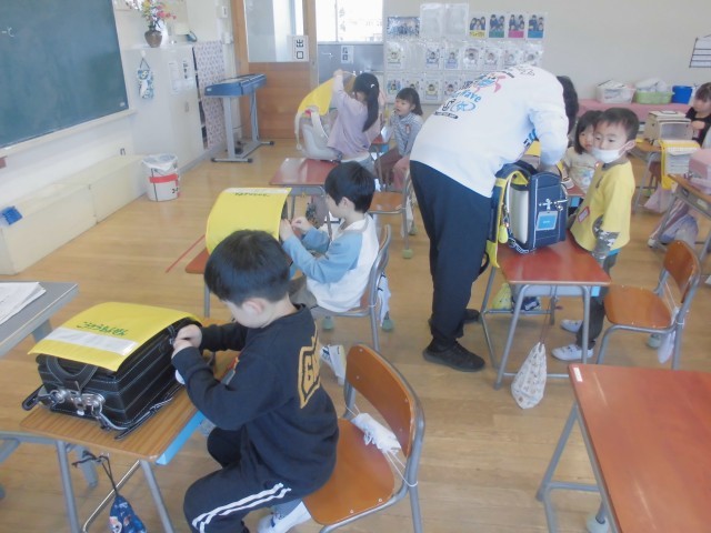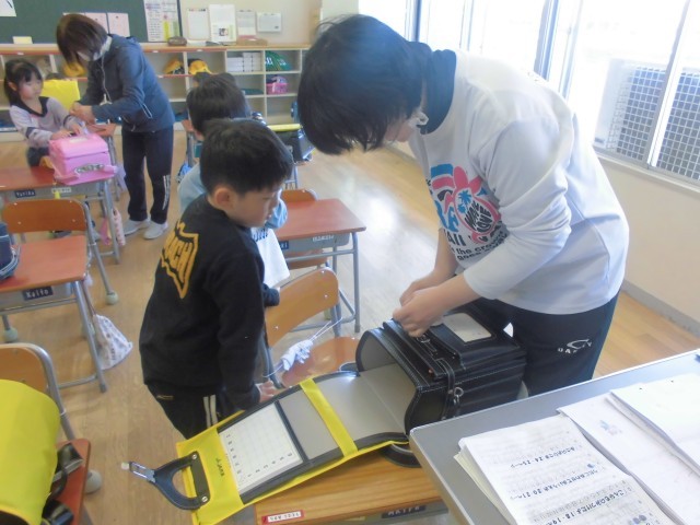 4月16日(水)1年生 学活 公開日 2025/04/16 更新日 2025/04/16 できごと ランドセルの手が届く同じ場所に防犯ブザーを取り付けます。黄色いランドセルカバー、黄色い帽子が1年生の装備です。 +3