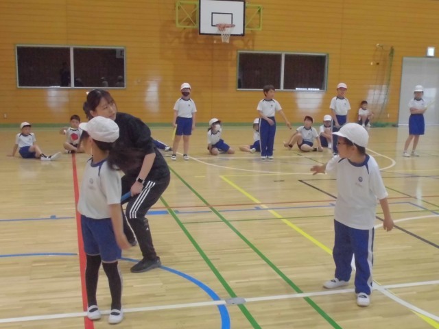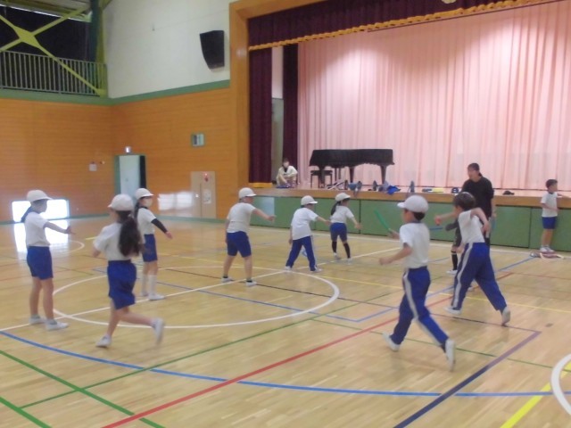 体育館でバトンパスの練習です。写真で見ると上手にパスすることができたようです。