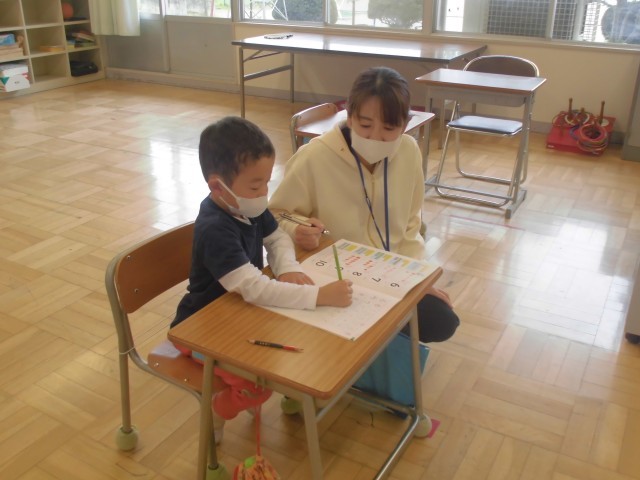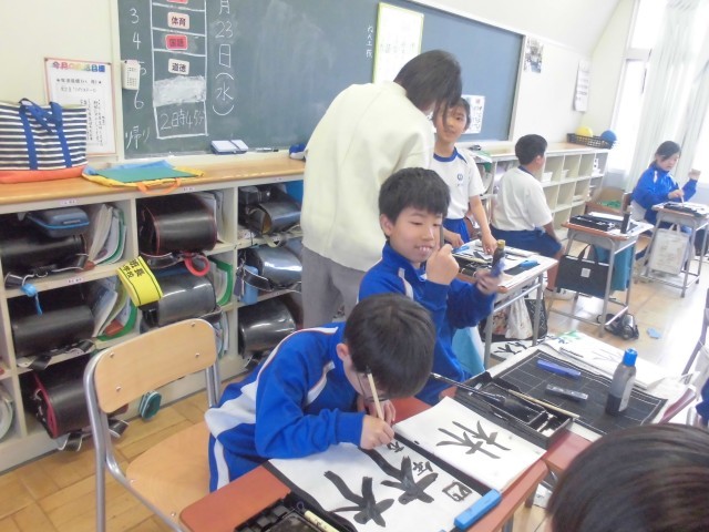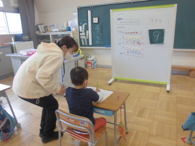 交流学級で書写の毛筆を頑張るようすと、教室で算数を頑張っているようすです。