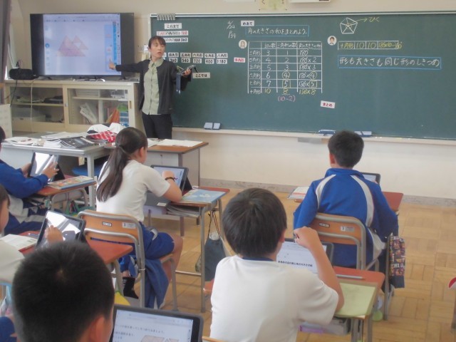 4月24日(木)5年生 算数 公開日 2025/04/24 更新日 2025/04/24 できごと タブレット上で、三角形を組み合わせて多角形を作図し、多角形の角の大きさの法則性を見つけます。こんな使用法はとても便利です。 +4