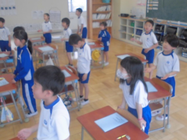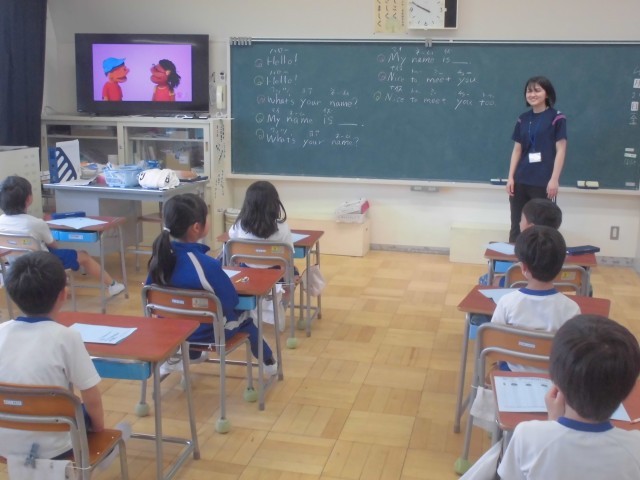 動画や音楽に合わせて、楽しく英語で自己紹介をします。ピントが甘くてすみません…